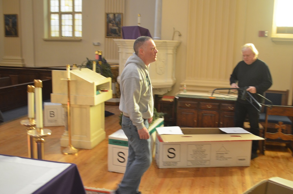 December 23, 2021, Decorating St. John the Evangelist Church for Christmas. (LtoR) Br. Sean McFarland and Br. William Key.