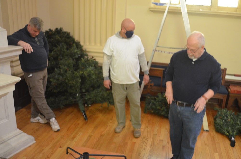 December 23, 2021, Decorating St. John the Evangelist Church for Christmas. (LtoR) Darryl Parsons, Bill Sohm and Br. Joe Swiss setting up Christmas trees.
