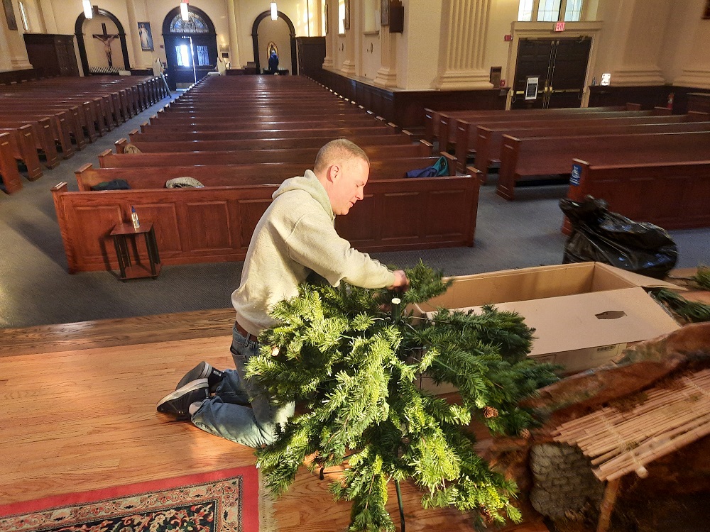 December 23, 2021, Decorating St. John the Evangelist Church for Christmas. Br. Sean McFarland assembles a Christmas tree.