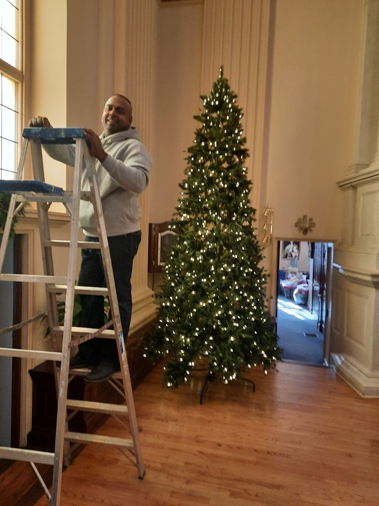 December 23, 2021, Decorating St. John the Evangelist Church for Christmas. Unidentified man installs window garland.