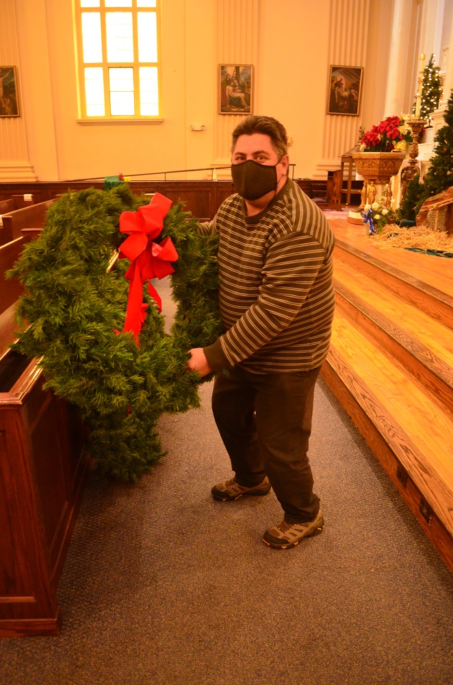 Br. Paul McGinley taking down window wreaths.