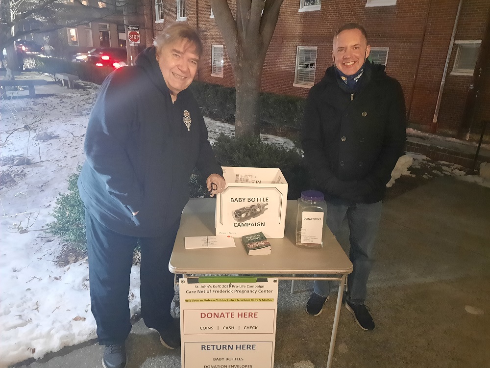 January 29, 2022. Last weekend of a three week drive for our annual "Baby Bottle Campaign" after Masses at the St. John the Evangelist Catholic Church, Fredrick, MD. All donations collected will go to CareNet of Frederick, which provides support to pregnant women.