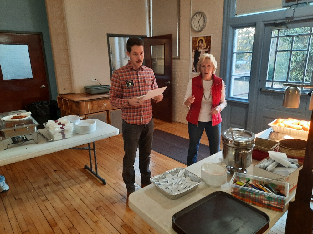 March 4, 2022. St. John's Council's Annual Lenten Friday Fish Dinners at the Sister Margaret Bauer Evangelization Center, 114 East Second Street, Frederick, MD. (LtoR) In the hall, Br. Peter Shuck and Regina Casazza stand at the server's station.