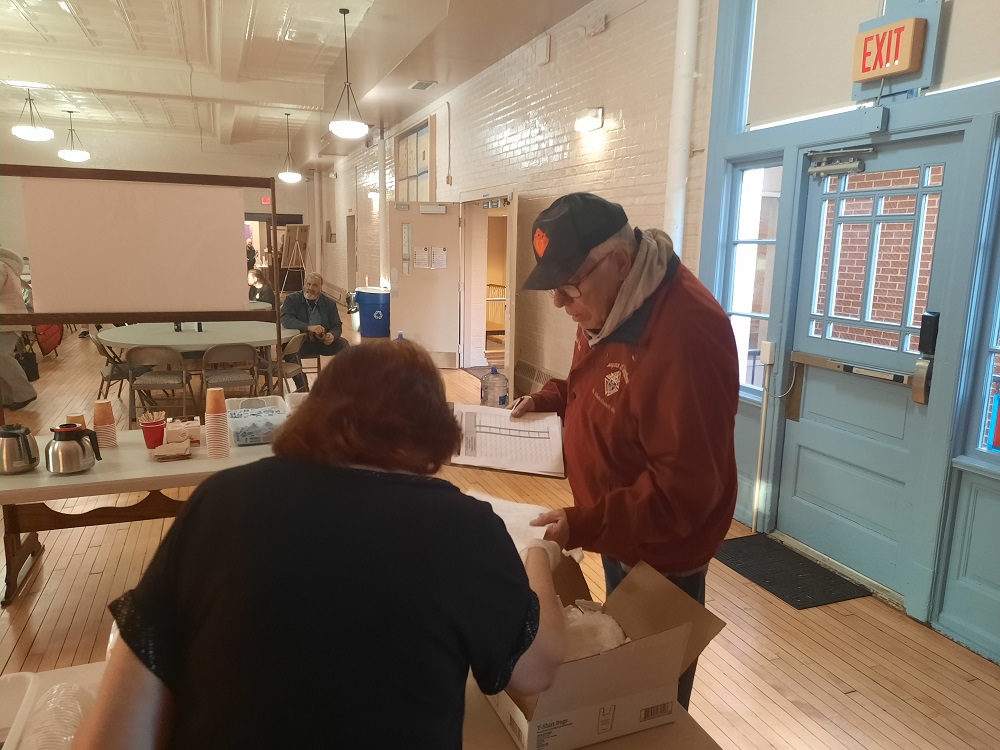 March 4, 2022. St. John's Council's Annual Lenten Friday Fish Dinners at the Sister Margaret Bauer Evangelization Center, 114 East Second Street, Frederick, MD. In the hall, Br. Bob Boehman gets to-go orders filled by Kathy Tokar.
