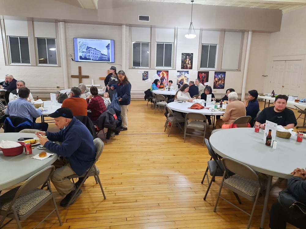 March 4, 2022. St. John's Council's Annual Lenten Friday Fish Dinners at the Sister Margaret Bauer Evangelization Center, 114 East Second Street, Frederick, MD. In the hall, families having dinner.