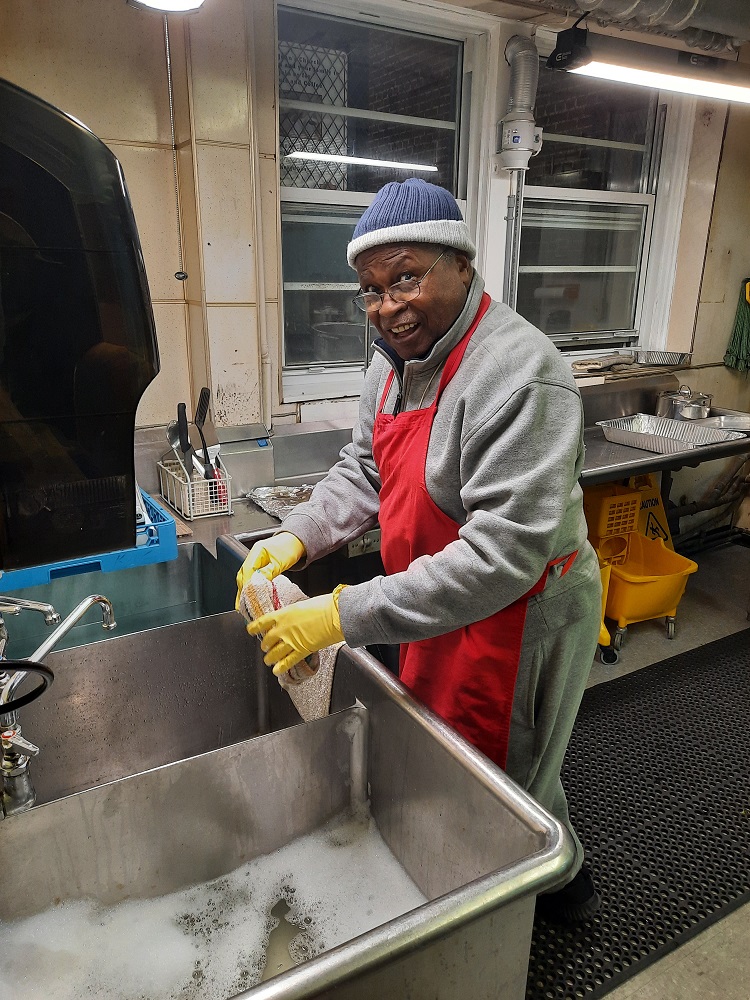 March 4, 2022. St. John's Council's Annual Lenten Friday Fish Dinners at the Sister Margaret Bauer Evangelization Center, 114 East Second Street, Frederick, MD. In the kitchen, Br. Ken Jorsling washing pots and pans.