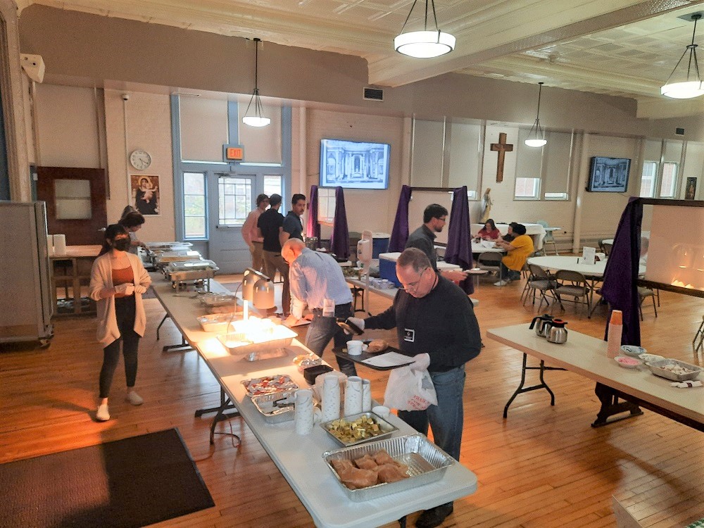 March 18, 2022. St. John's Council's Annual Lenten Friday Fish Dinners at the Sister Margaret Bauer Evangelization Center, 114 East Second Street, Frederick, MD. Our serving line and wait staff hard at work.