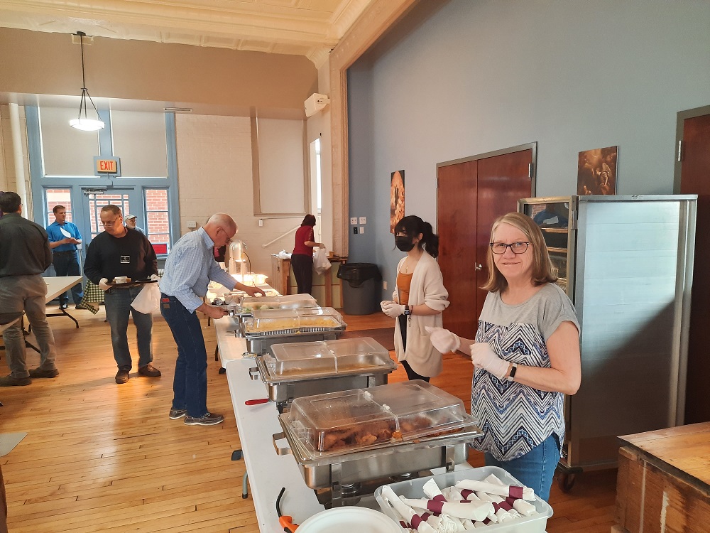 (LtoR) Br. Craig Giandgrande and PGK Rick Casazza assembling meals on left. A youth volunteer from St. John's Catholic Prep and Linda Hansen on the right behind the serving line.