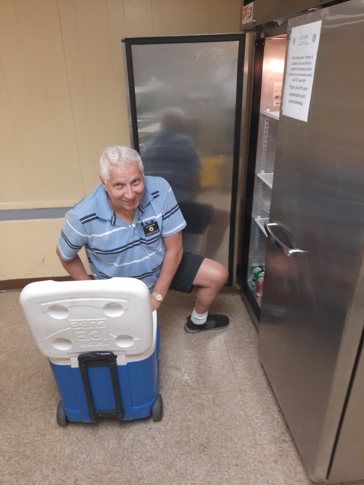 March 18, 2022. St. John's Council's Annual Lenten Friday Fish Dinners at the Sister Margaret Bauer Evangelization Center, 114 East Second Street, Frederick, MD. Br. Joe Rigutto returns unused sodas to the refrigerator.