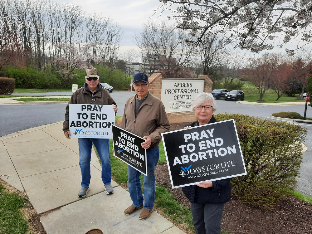 Tuesday, April 5, 2022. St. John's members at 40 Days for Life Lenten Vigil in front of Planned Parenthood at 170 Thomas Johnson Drive, Frederick, MD. (LtoR) Br. Bob Boehman, Br. Bob Willson and Martha Willson.