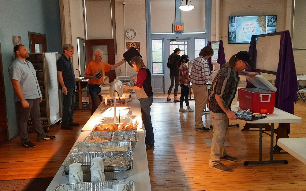 Serving team (LtoR): Br. Joe Foehrkolb, Br. Jim Moore, Br. Gary Hansen, Linda Hansen, Ivana Shuck (facing away), two youth volunteers from St. John's Catholic Prep, and PGK Jim Sier.