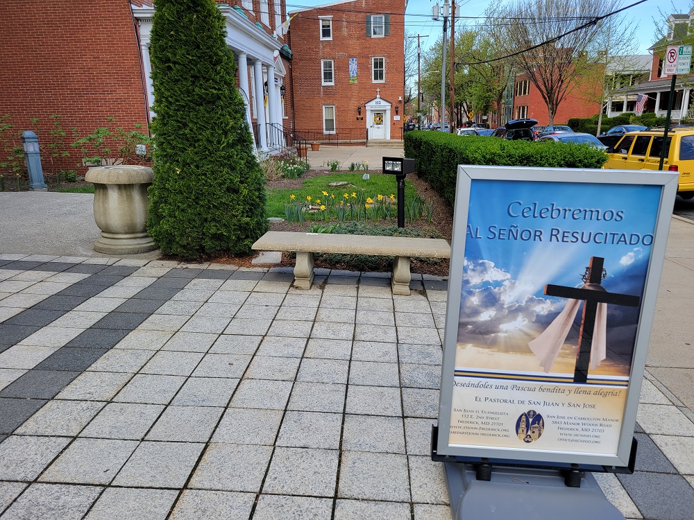 Holy Saturday, April 16, 2022. Knights of St. John's Council assist with decorating for Easter at St. John the Evangelist Church, Frederick, MD. Front of church, looking to the right.