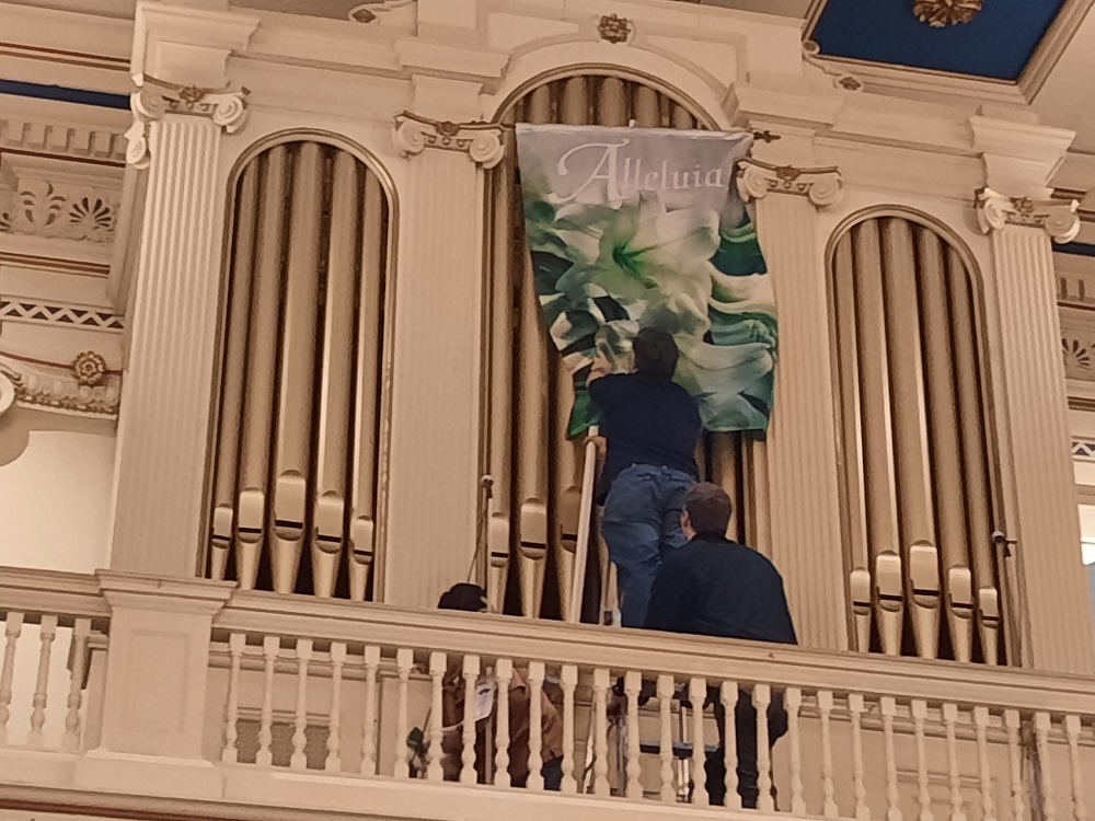 (LtoR) Grand Knight Lee Ericksen on ladder and Br. John Shearin hang a banner in the choir loft. Br. Woody Johnston is kneeling to left while working behind the railing.