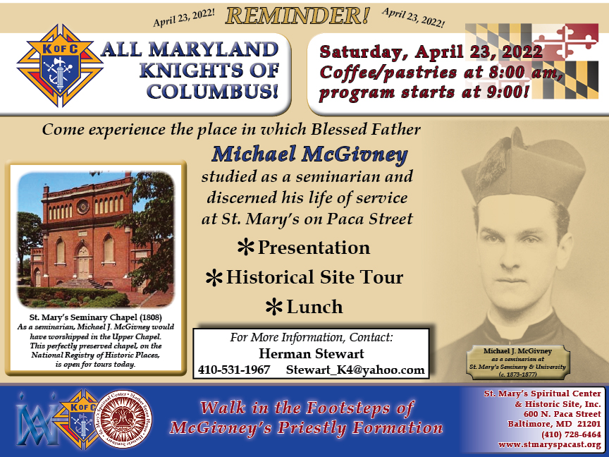 Saturday, April 23, 2022. Knights and family members attend a Knights of Columbus sponsored tour of the St. Mary's Seminary Chapel and the Mother Seton House at 600 N. Paca Street, Baltimore, MD. This site is where the Blessed Rev. Michael McGivney (founder of the Knights of Columbus) attended seminary and where Saint Elizabeth Ann Seton took her holy orders.