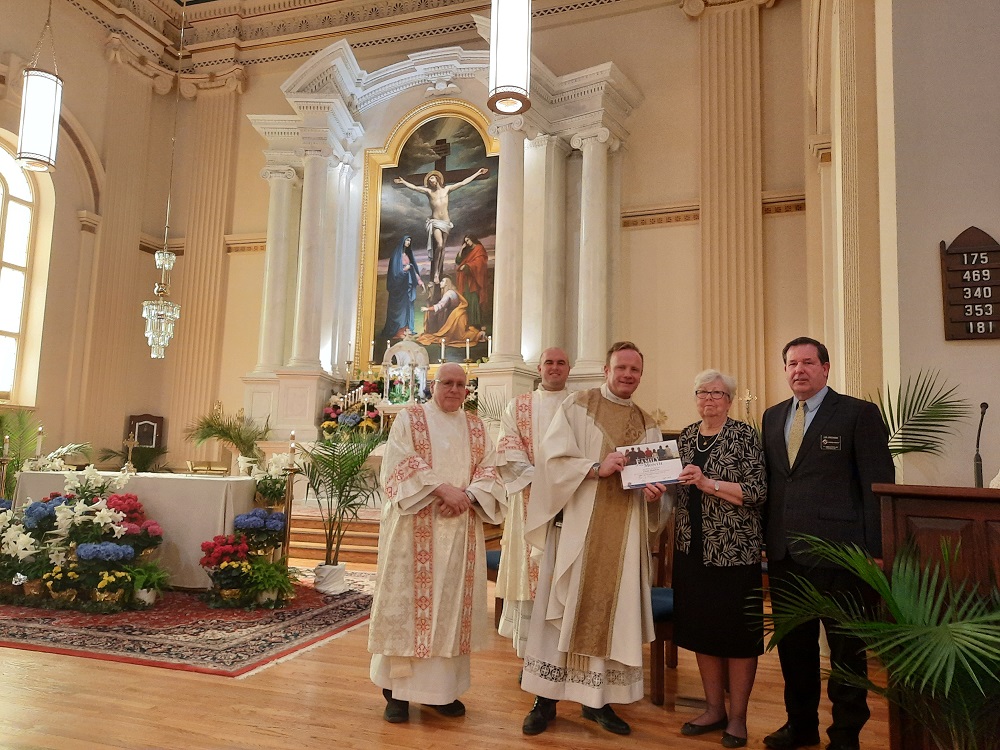 (LtoR) Deacon Doug Nathan, Deacon Christian Schwenka, Pastor Rev. John Williamson, Dean Baldwin holding the award, and Grand Knight Lee Ericksen.
