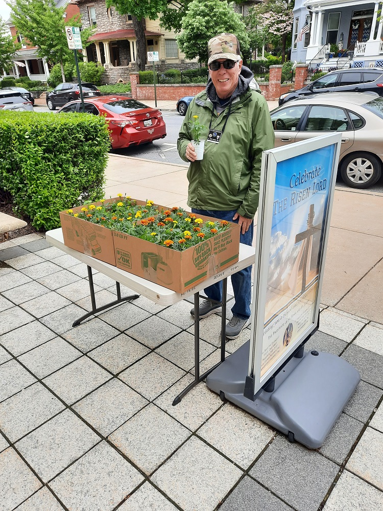 Sunday, May 8, 2022. Members of St. John's Council hand out marigolds to mothers after Mothers Day Weekend Masses at St. John the Evangelist Church, Frederick, MD. Br. Bob Boehman.