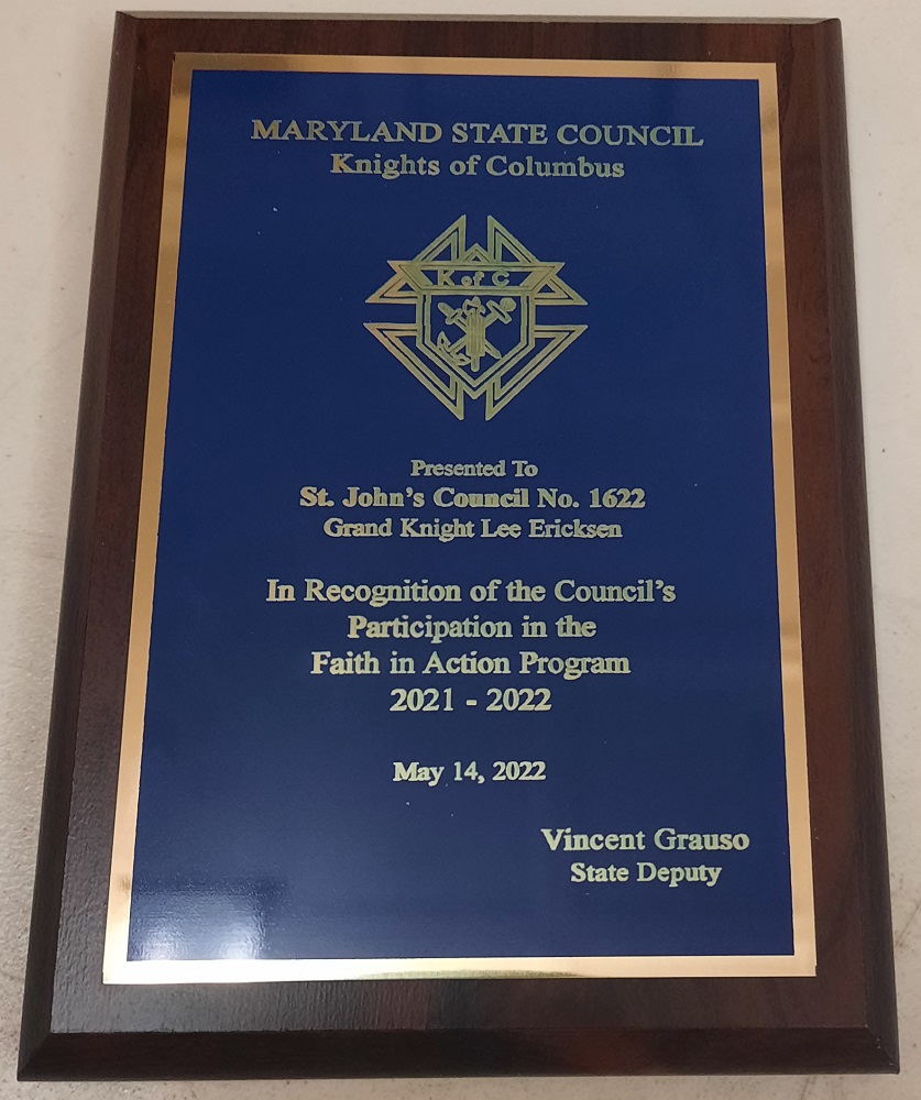 Faith in Action Program Award to St. John's Council for the 2021-2022 Fraternal Year.
