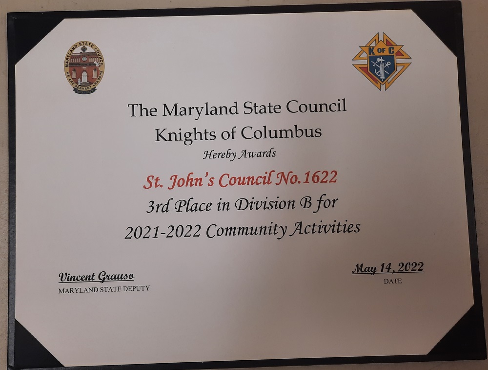 Third Place in Division B Award for Community Activities to St. John's Council for the 2021-2022 Fraternal Year.