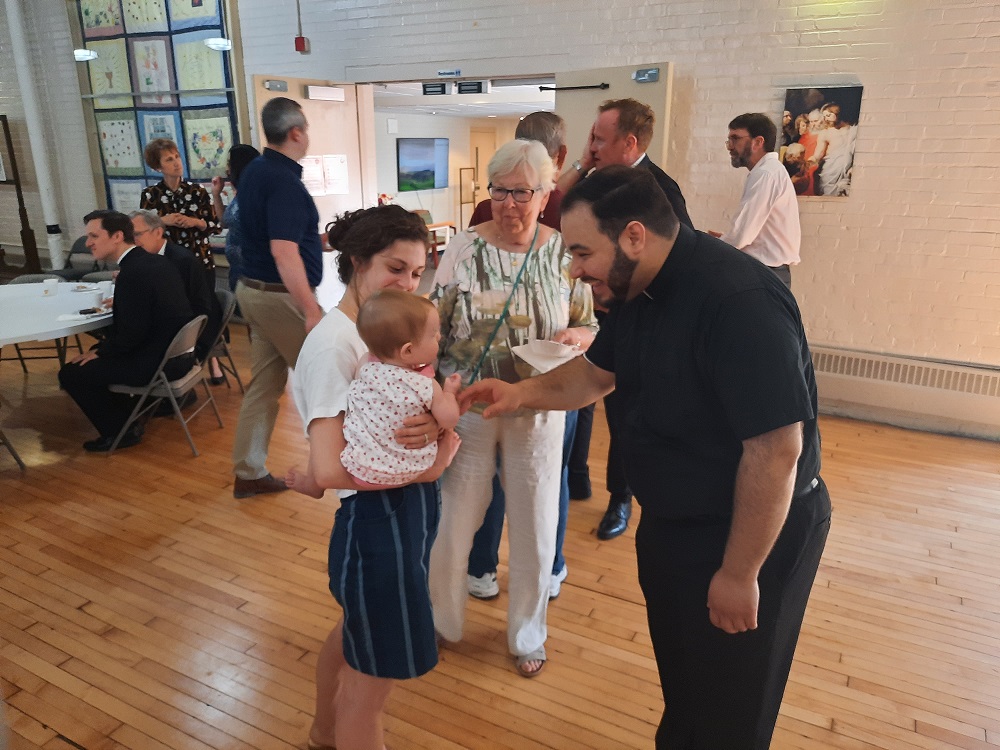 Deacon Javier Fuente Cabrera greets a very young parishioner.