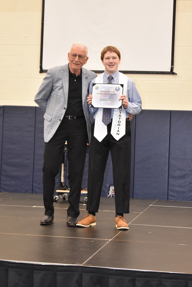 Friday, June 03, 2022. District Deputy PGK Rick Casazza presents an award for "Exemplary Graduate who Embodies the Principles of the Knights of Columbus" for the Graduating Class of 2022 at St. John's Regional Catholic School, Frederick, MD.