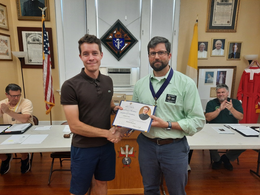 Tuesday, July 19, 2022. Br. Peter Shuck (L) receives his overdue 3rd Degree Certificate from 28 March 2022 from Grand Knight Rick Babbitt (R).