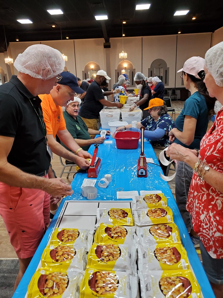 Saturday, August 13, 2022. PGK Rick Casazza (far left) and Regina Casazza (far right) volunteer at Tri-Chapter (Chapters of Grand Knights) Food Packing event at Boswell Hall, Bowie, Maryland.