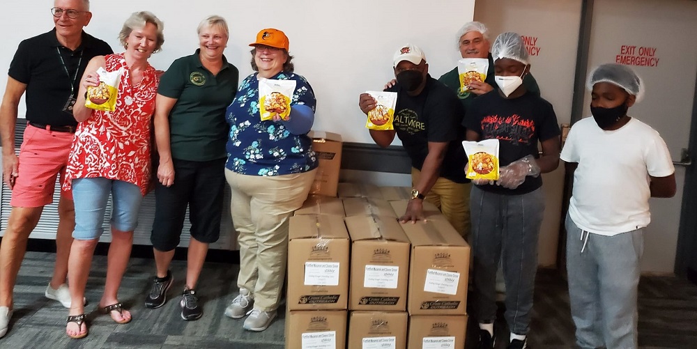 Saturday, August 13, 2022. PGK Rick Casazza (far left) and Regina Casazza (second from left) volunteer at Tri-Chapter (Chapters of Grand Knights) Food Packing event at Boswell Hall, Bowie, Maryland.