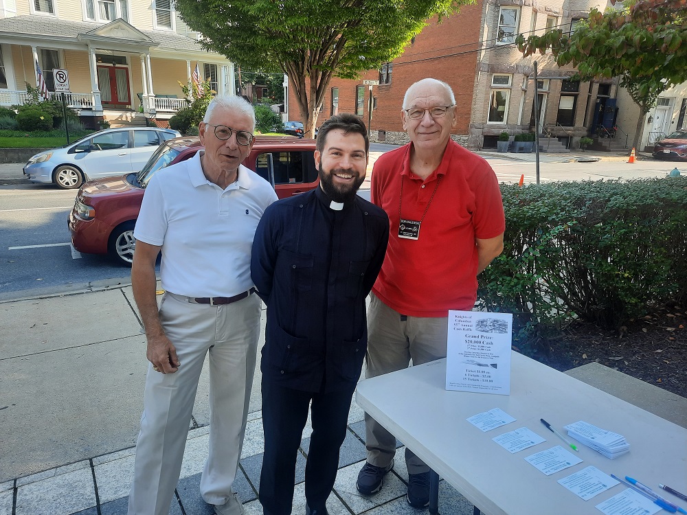 Sunday, September 18, 2022. St. John's Council No. 1622, sells raffle tickets after Mass in front of St. John the Evangelist Church, Frederick, MD. (LtoR) PGK Rick Casazza, Rev. Matt DeFusco, and PGK Bob Krajewski.