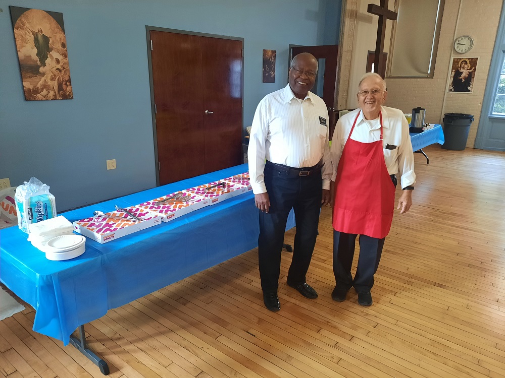 (LtoR) Br. Ken Jorsling and Br. Woody Johnston set up coffee and donuts for the ministries fair.