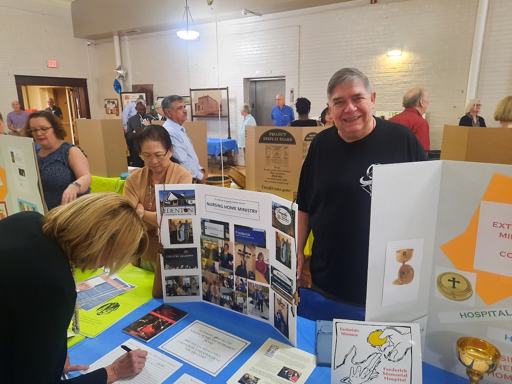 (LtoR) Br. Mike Willett serves at the booth for extraordinary ministers of holy communion at the ministries fair.