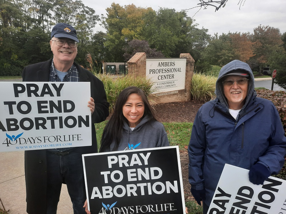 October 4, 2020 - Forty Days for Life vigil in front of Planned Parenthood office on Thomas Johnson Drive, Frederick, MD. (LtoR) PGK Dave Satterfield, another prayer volunteer, and Br. Woody Johnston.