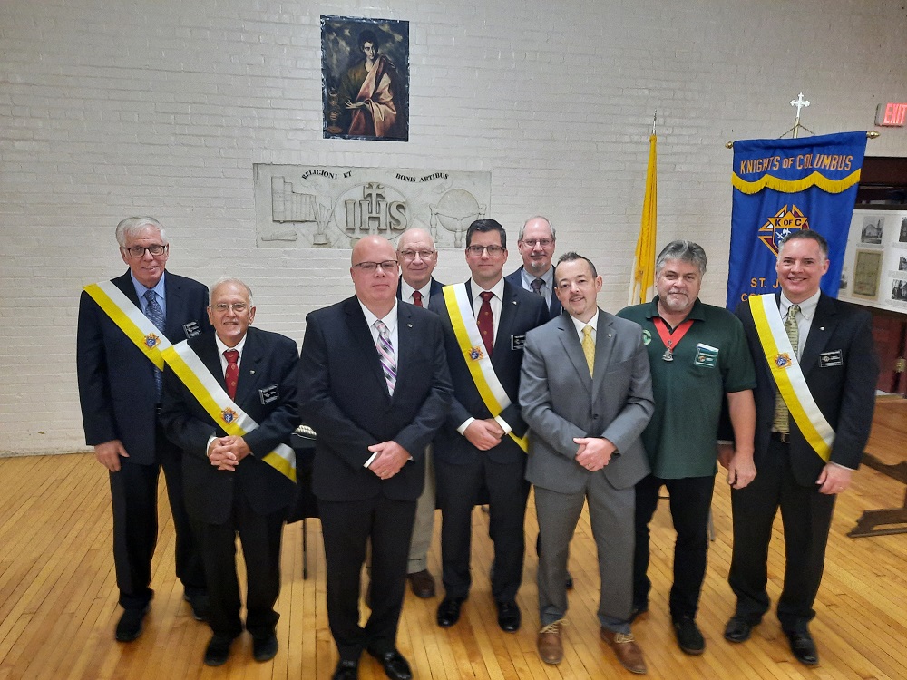 (LtoR) Degree team member (DTM) Robert Boehman, DTM Woody Johnston, new third degree member William Sohm , DTM Robert Krajewski, Grand Knight Richard Babbitt, DTM Brett Hunt, new third degree member Bobby McQuin, District Deputy Thomas Plunkett, and DTM Sean McFarland.