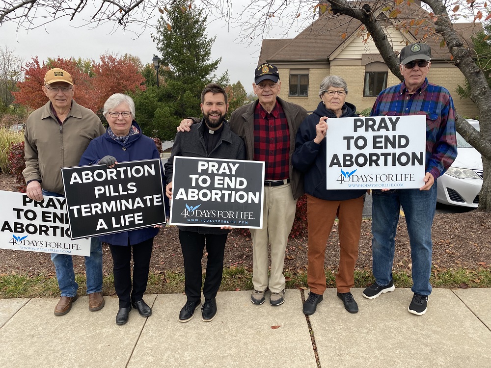 October 25, 2020 - Forty Days for Life vigil in front of Planned Parenthood office on Thomas Johnson Drive, Frederick, MD. (LtoR) Br. Bob Willson, Martha Willson, Rev. Matt DeFusco, Deacon Dan Roff, Clarice Roff, and Br. Bob Boehman.
