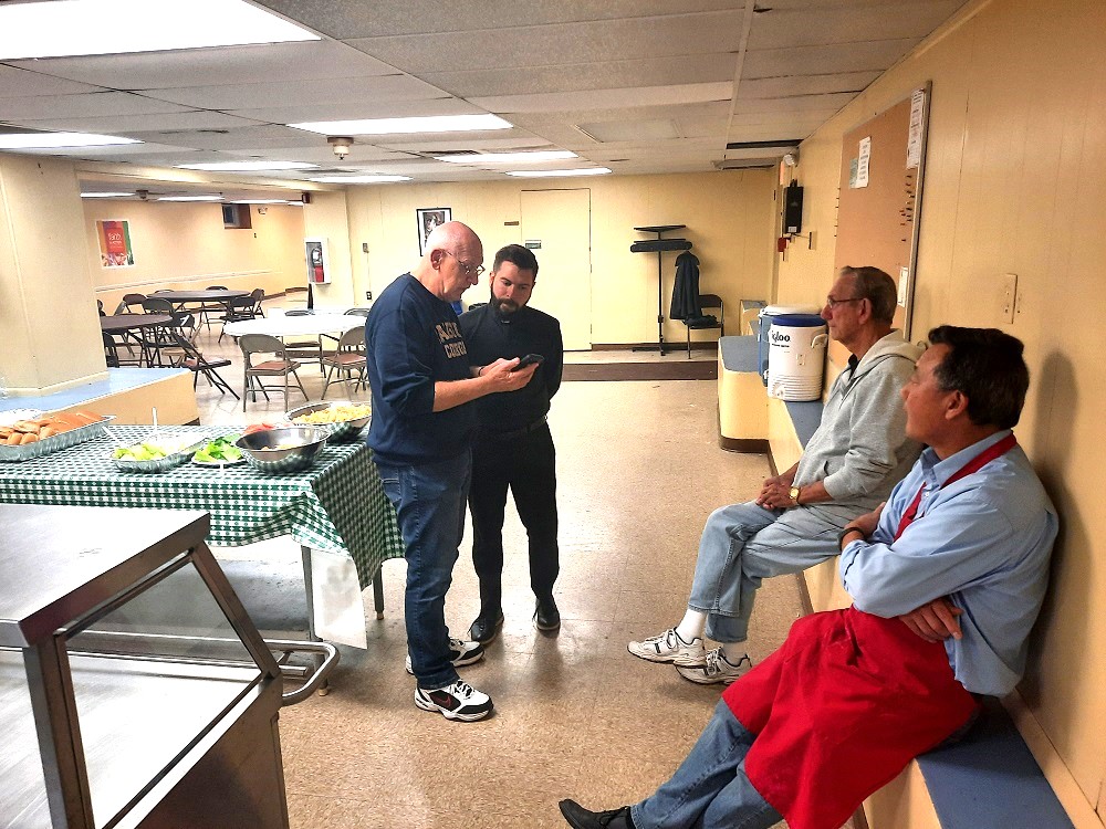 Tuesday, October 25, 2022 - Food prep team before the Men's Feast gathering in the cafeteria of St. John the Evangelist Church, Frederick, MD. (LtoR)PGK Bob Krajewski, Fr. Matt DeFusco, Br. Pete Tokar and Br. Maurice Wong.