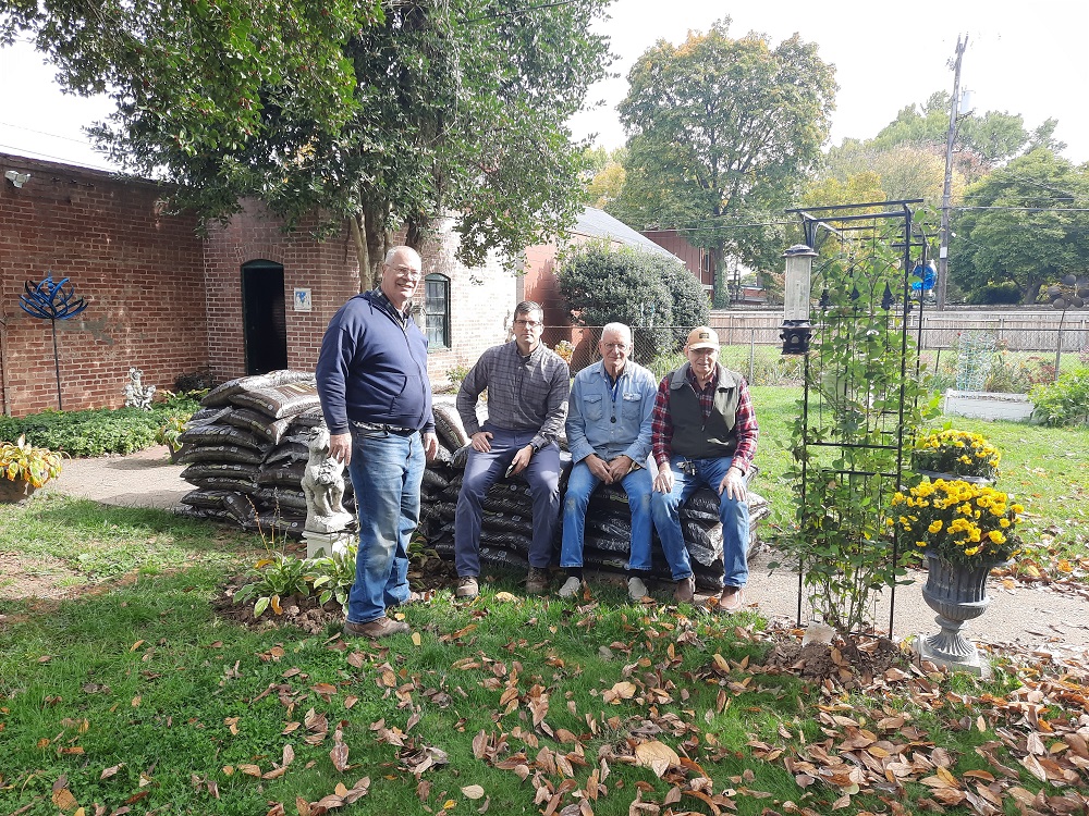Delivery team rests on a pallet's worth of mulch bag's in the rectory's back yard. (LtoR) PGK Dave Satterfield, Grand Knight Rick Babbitt, PGK Rick Casazza, and Br. Bob Willson. Photo taken by parish employee Nathan Fulton, who also helped with delivery.