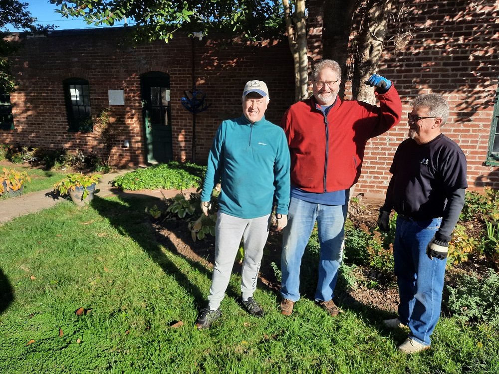 (LtoR) Choir member Leo Komorowski, choir member Eric Hutchinson, and aother parishioner in the rear yard of the rectory.