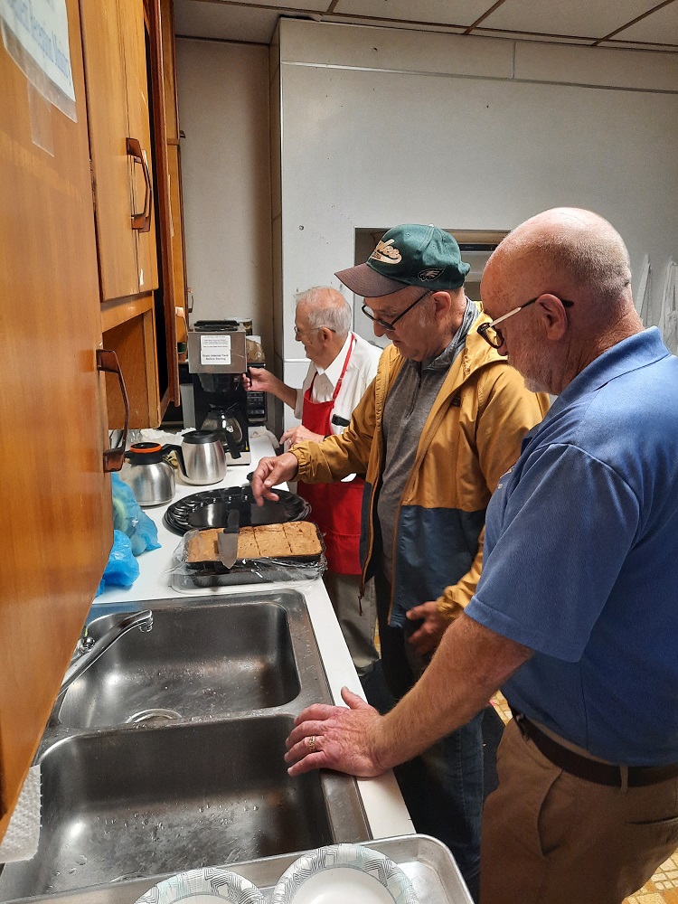 (LtoR) Br. Woody Johnston makes coffee and Br. John Fischer cuts brownies donated by Br. Tom Rogers (looking on) in the old-rectory kitchen. Br. Tom is a co-owner of Uncle Ralph's Cookies of Frederick.