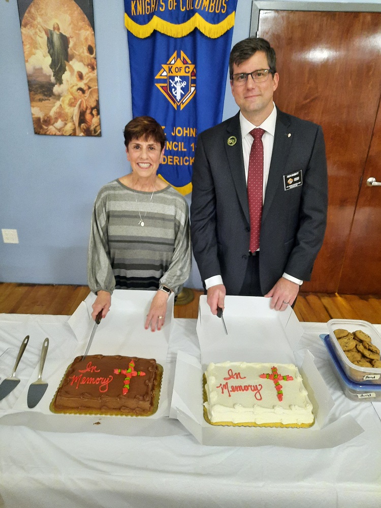 During the post-Mass reception, CDA Regent Jeanne Willett and St. John's Council Grand Knight Rick Babbitt cut two cakes. Tasty home made desserts brought in by participants are aligned off camera to the right.