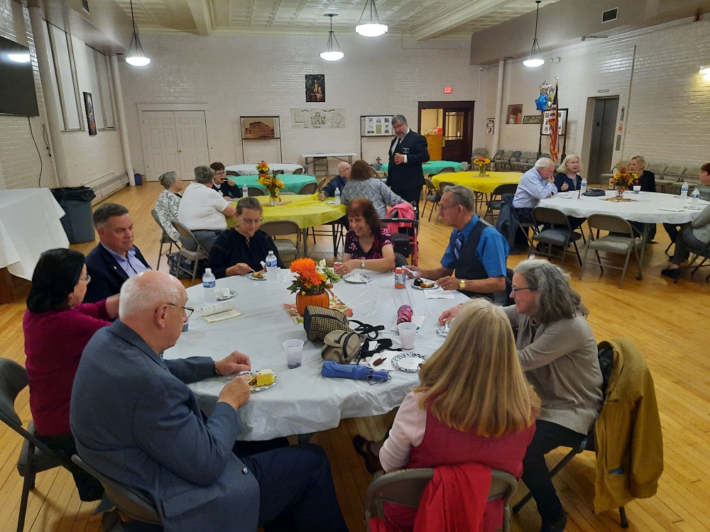 During the post-Mass reception, near table (clockwise, LtoR) PGK Bob Krajewski (blue jacket), Da. Bonnie Rohr, Br. Bill Bond, Ronda Bond, Kathy Tokar (who served as our Cantor for the Mass), SK Pete Tokar, unidentified lady, and Debbie Krajewski.