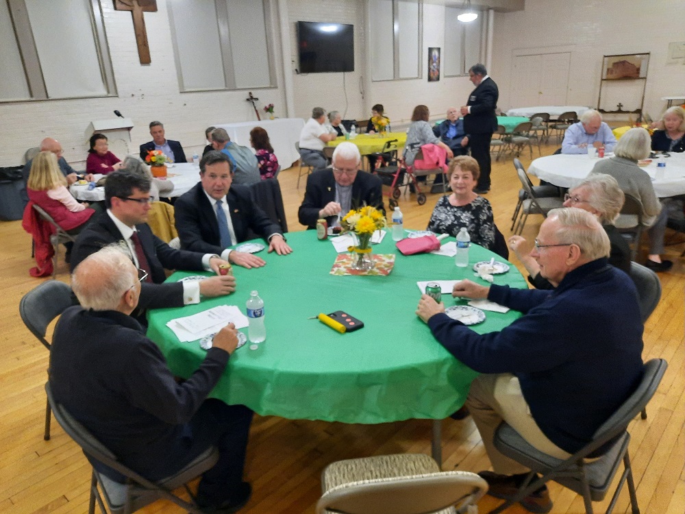 During the post-Mass reception, near table (LtoR) SK Woody Johnston, Grand Knight Rick Babbitt, PFN/PGK Lee Ericksen, Deacon SK Doug Nathan, Linda Boehman, Martha Willson, and Br. Bob Willson.