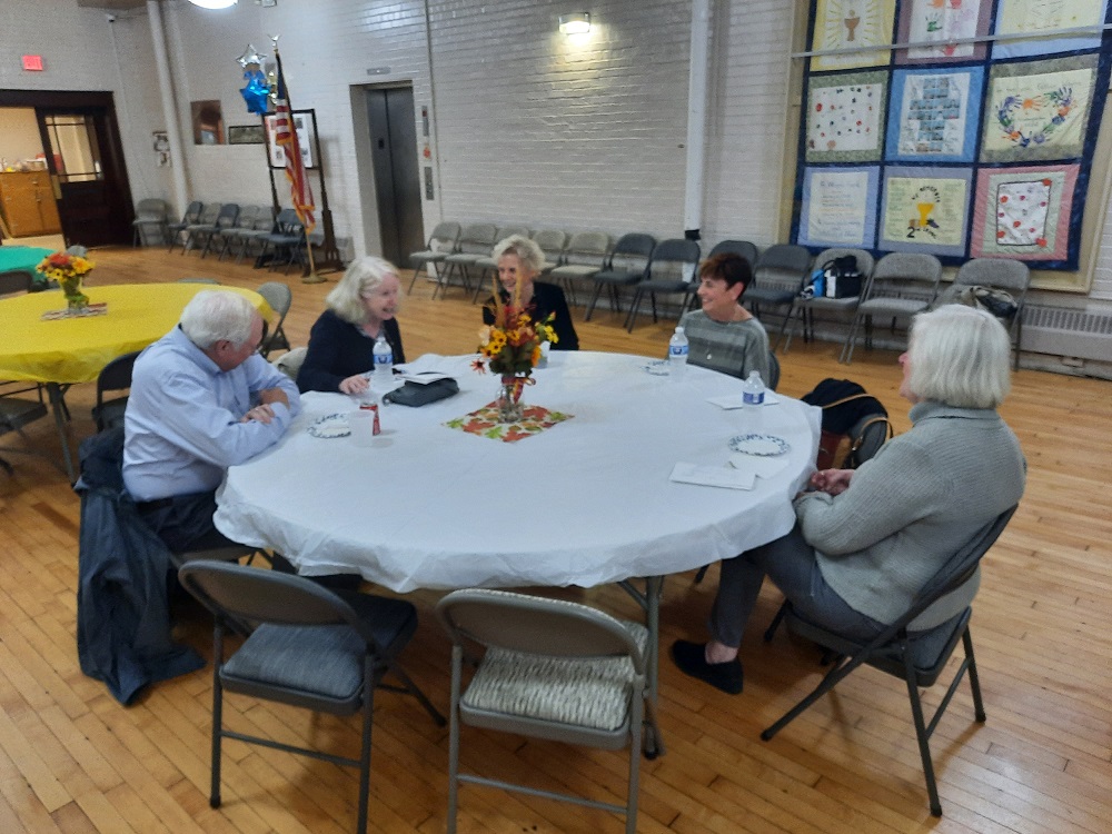 During the post-Mass reception, table (LtoR) unidentified man, unidentified lady, Da. Lynn Rinehart, Regent Jeanne Willett, and Da. Sandy Corridon.
