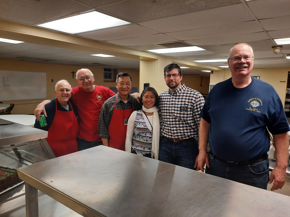 Prep team in the cafeteria before the dinner, (LtoR) Br. Woody Johnston, PGK Bob Krajewski (dinner coordinator), Br. Maurice Wong (suis chef), Karlene Wong, Grand Knight Rick Babbitt, and PGK Dave Satterfield.
