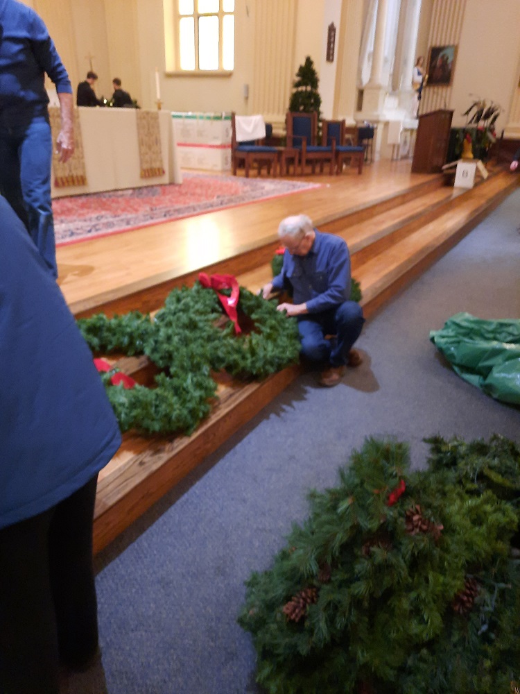 Dec 23, 2022. Knights help with decorating St. John the Evangelist Church for Christmas. Br. Bob Willson prepares wreaths for the windows.