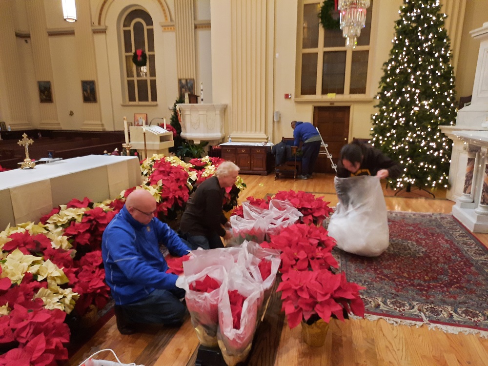 Dec 23, 2022. Knights help with decorating St. John the Evangelist Church for Christmas. Phase II, adding flowers. (LtoR) (LtoR) Br. William Sohm, Br. William Key and an unnamed parishioner work with poinsettias.
