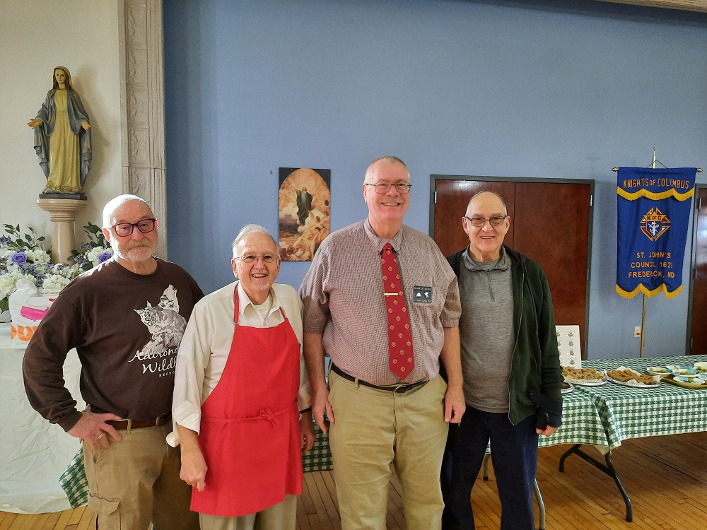 St. John's Council hosts our monthly coffee and donut social after Masses at St. John the Evangelist Catholic Church on January 8, 2023. Set up team (LtoR) Br. Tom Rogers (Team Leader), Br. Woody Johnston, PGK Dave Satterfield, and Br. John Fischer.