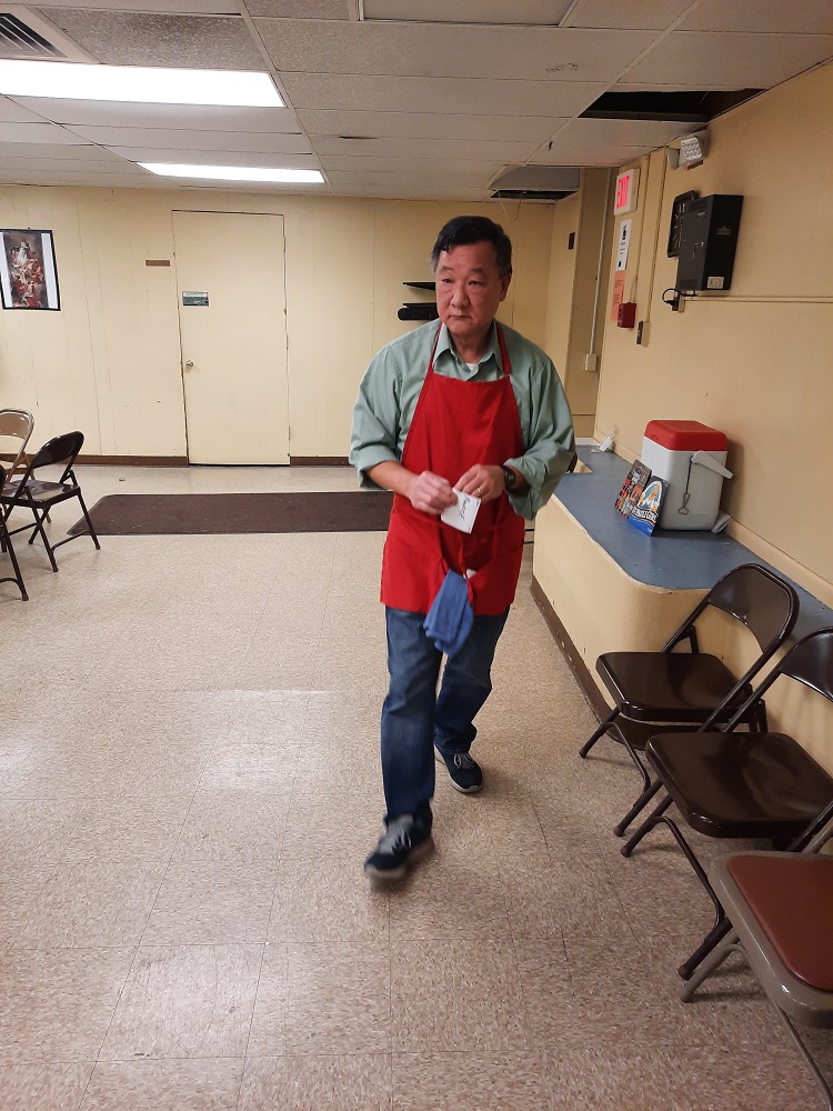 Fr. Matt's monthly parish Men's Feast in the cafeteria at St. John the Evangelist Catholic Church on Tuesday, January 10, 2023. Kitchen staff for a great chili dinner, sous chef Br. Maurice Wong.