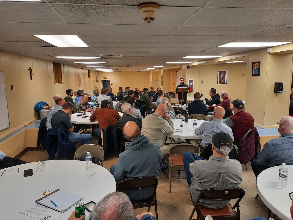 Fr. Matt DeFusco's monthly parish Men's Feast in the cafeteria at St. John the Evangelist Catholic Church on Tuesday, January 10, 2023. Fr. Matt begins the post-dinner faith discussion.