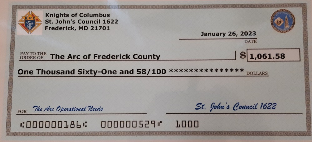 January 26, 2023. St. John's Council 1622, Knights of Columbus, presents a check to the ARC of Frederick on Market Street. Proceeds are from our November Tootsie Roll Drive to help the intellectually challenged.