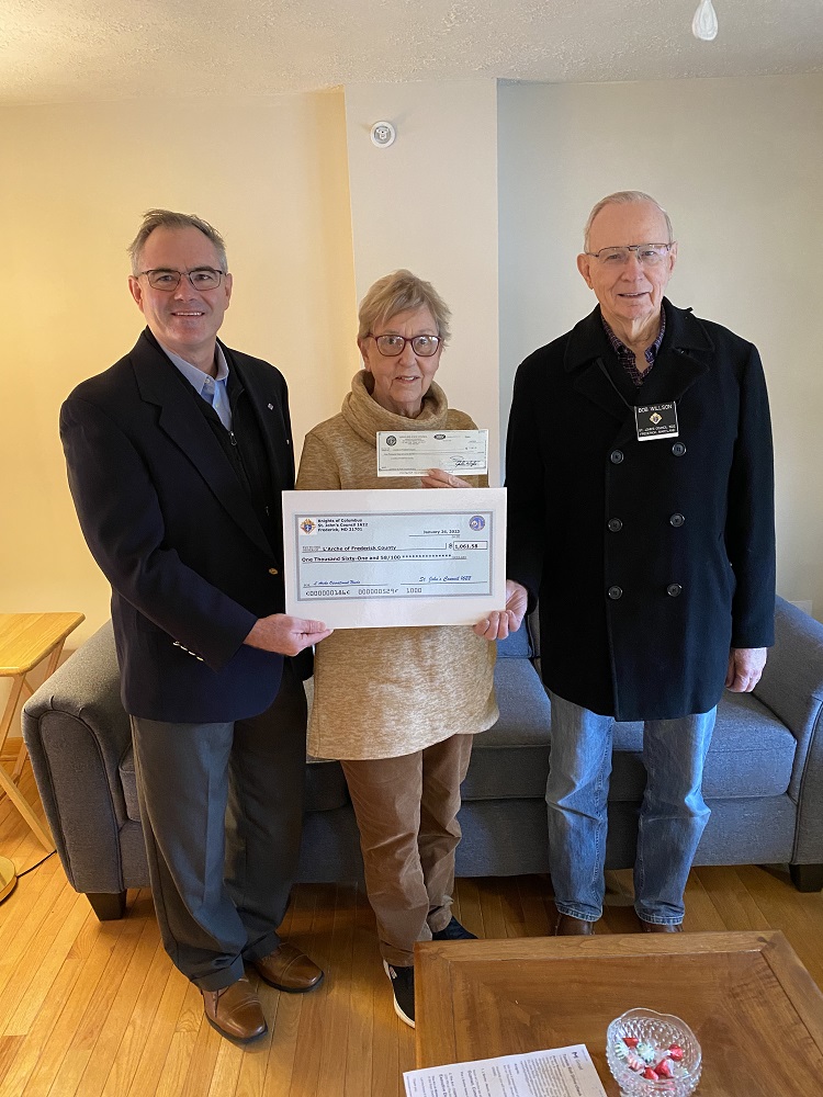 January 26, 2023. St. John's Council 1622, Knights of Columbus, presents a check to L'Arche of Frederick MD. Proceeds are from our November Tootsie Roll Drive to help the intellectually challenged.