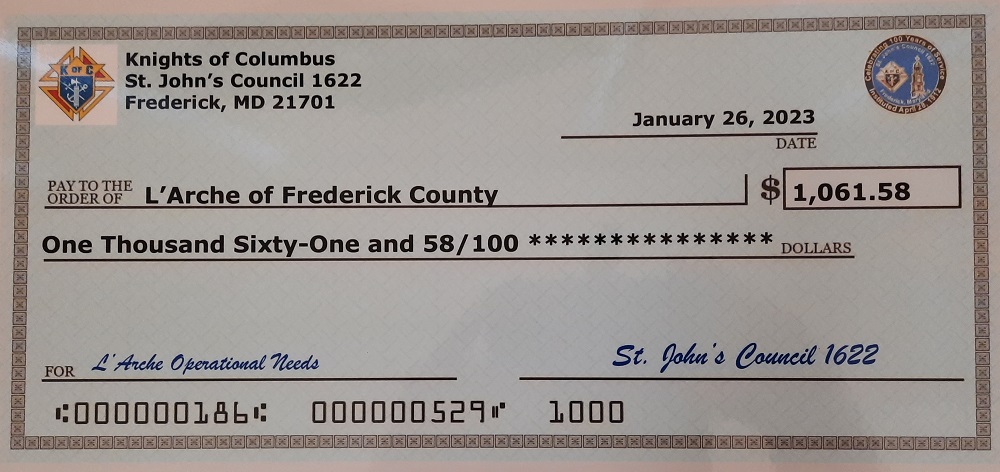 January 26, 2023. St. John's Council 1622, Knights of Columbus, presents a check to L'Arche of Frederick MD. Proceeds are from our November Tootsie Roll Drive to help the intellectually challenged.